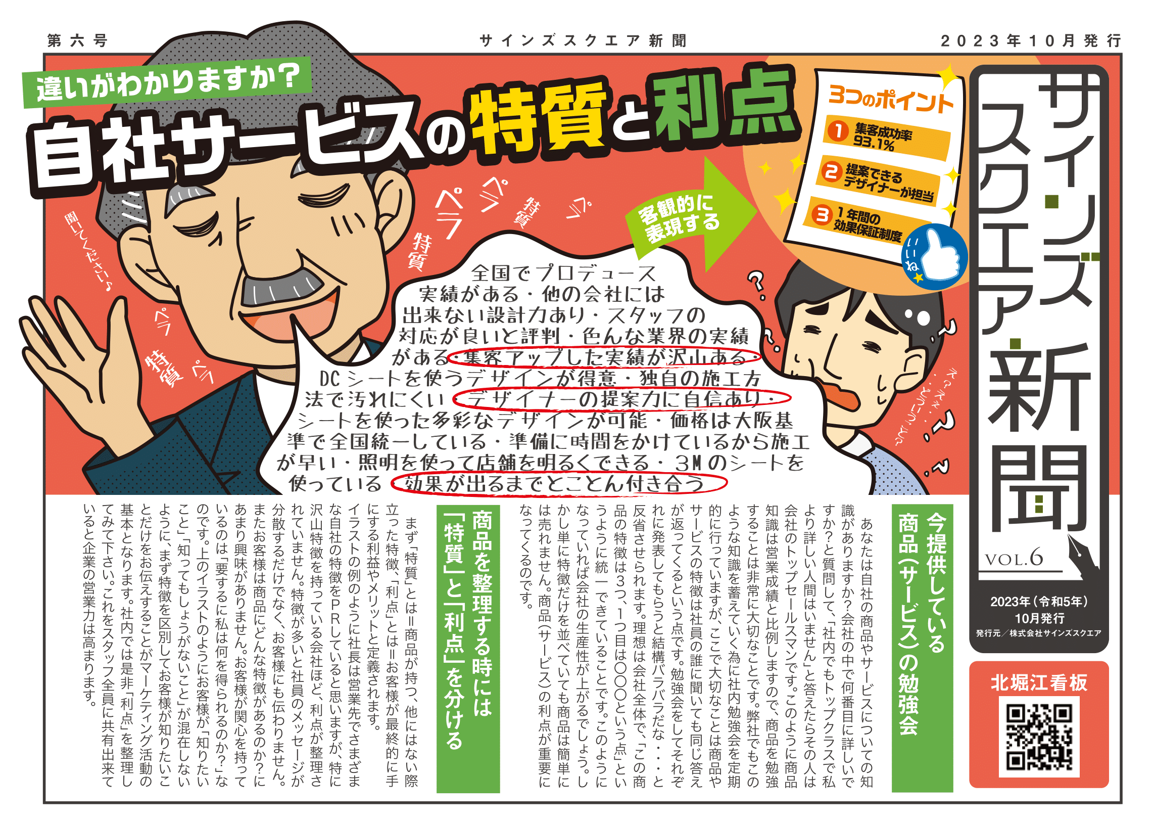 サインズスクエアニュースレター10月号発刊 ニュースレター X Facebook はてブ Pocket LINE コピー 2023.10.16 サインズスクエアニュースレター10月号を発刊いたしました。 ニュースレター10月号は「自社サービスの特質と利点」というテーマで、会社の生産性を上げるためには、商品(サービス)の利点を整理することが重要であると言及しております。 その他にも、お客様のお声やさまざまな制作事例などをご紹介しております。ぜひご覧ください。