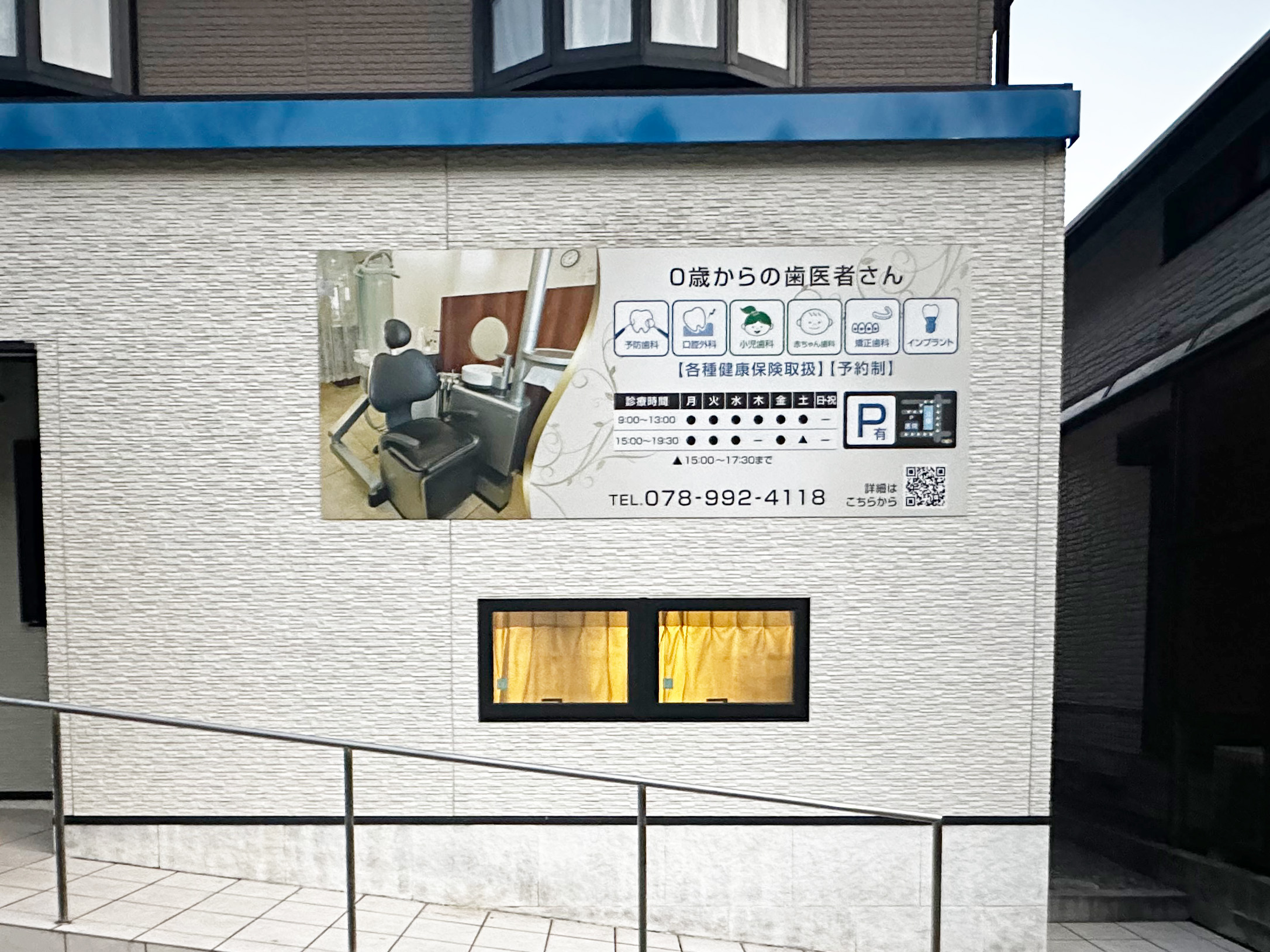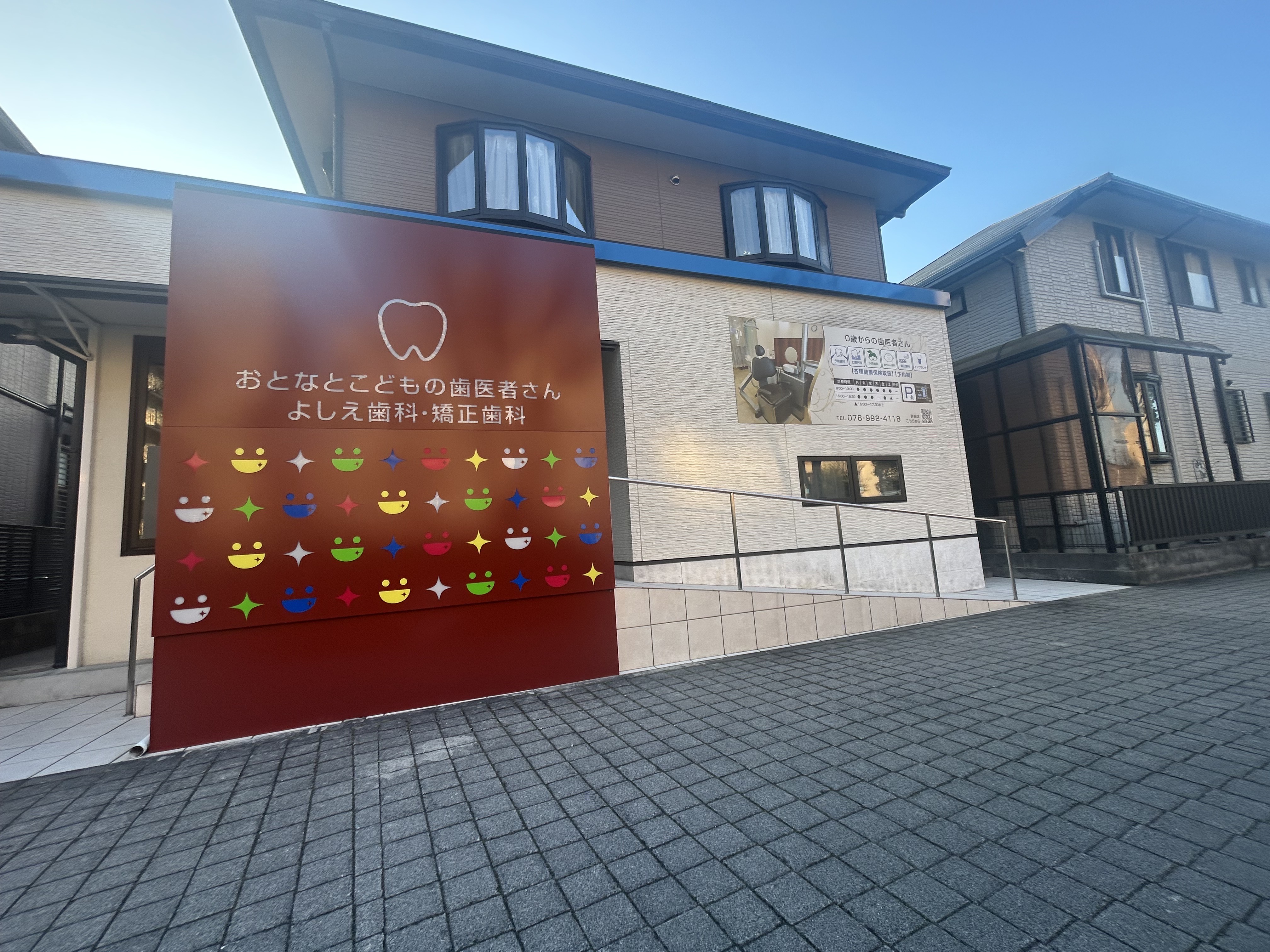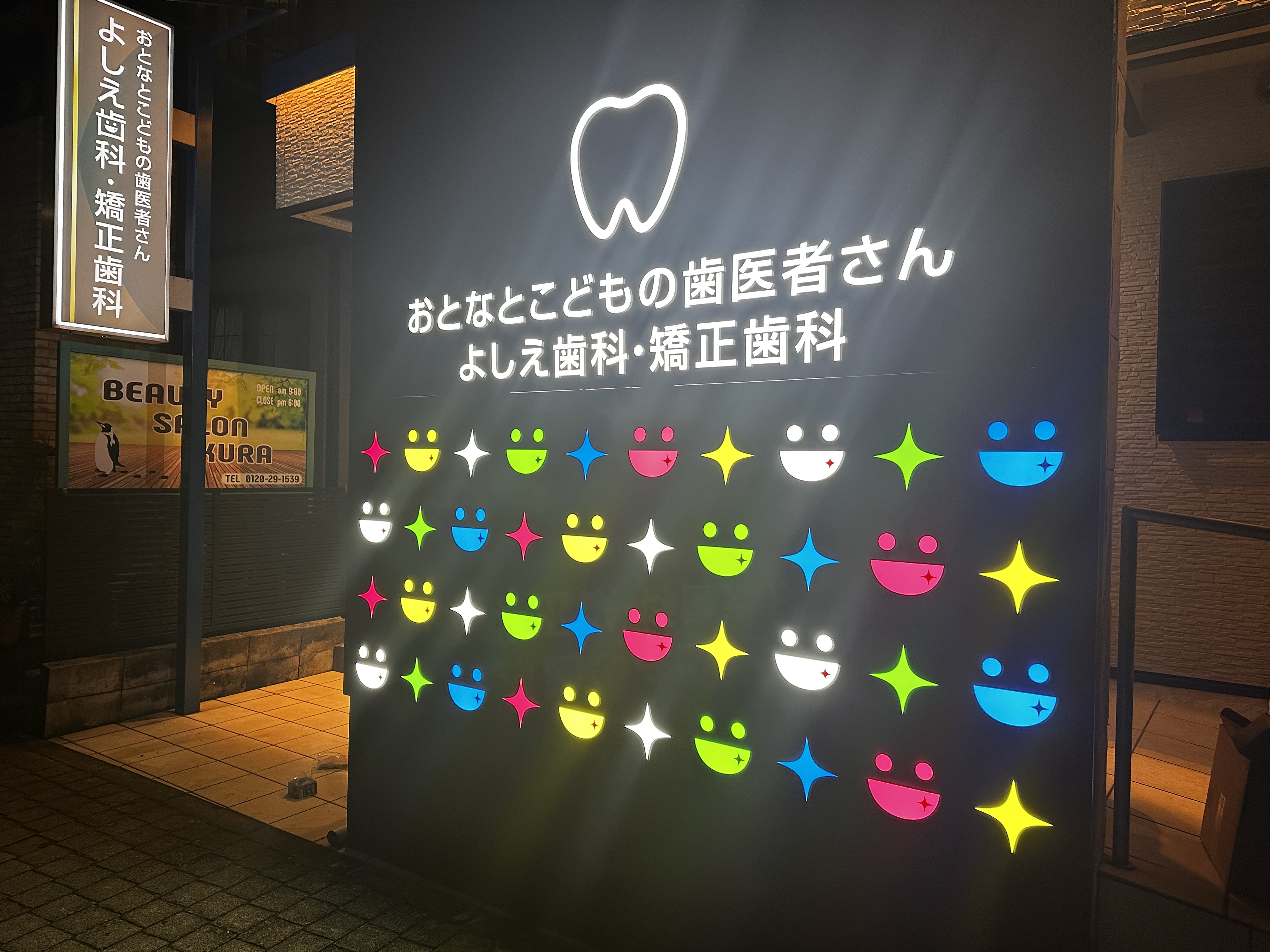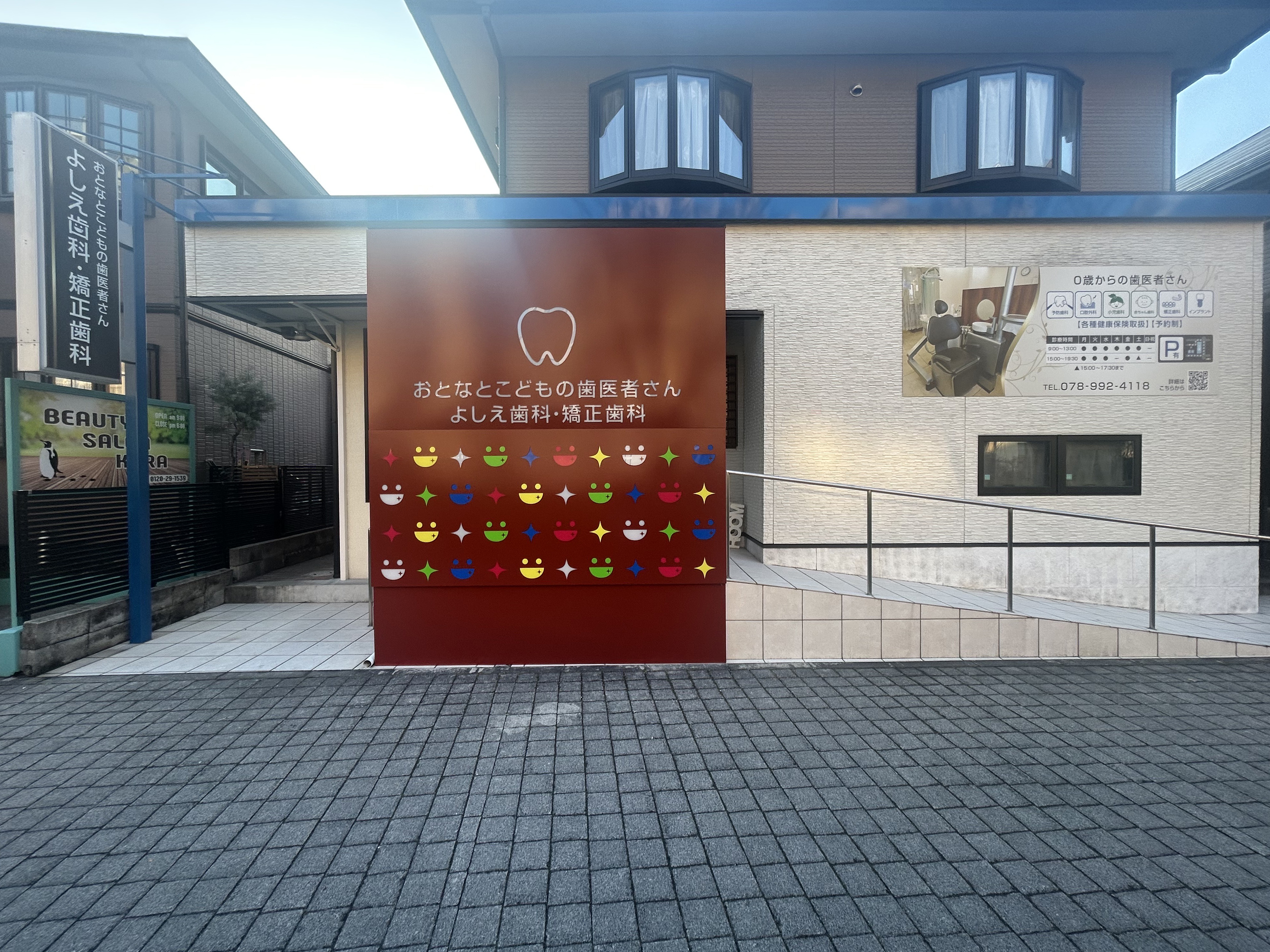 神戸市営地下鉄 西神南駅より徒歩7分・兵庫県神戸市にあるおとなとこどもの歯医者さんよしえ歯科・矯正歯科さまの施工事例です。おとなとこどもの歯医者さんよしえ歯科・矯正歯科さまのリニューアルに伴う外観制作を担当させていただきました。カラフルな顔のマークで存在感のある外観になりました。