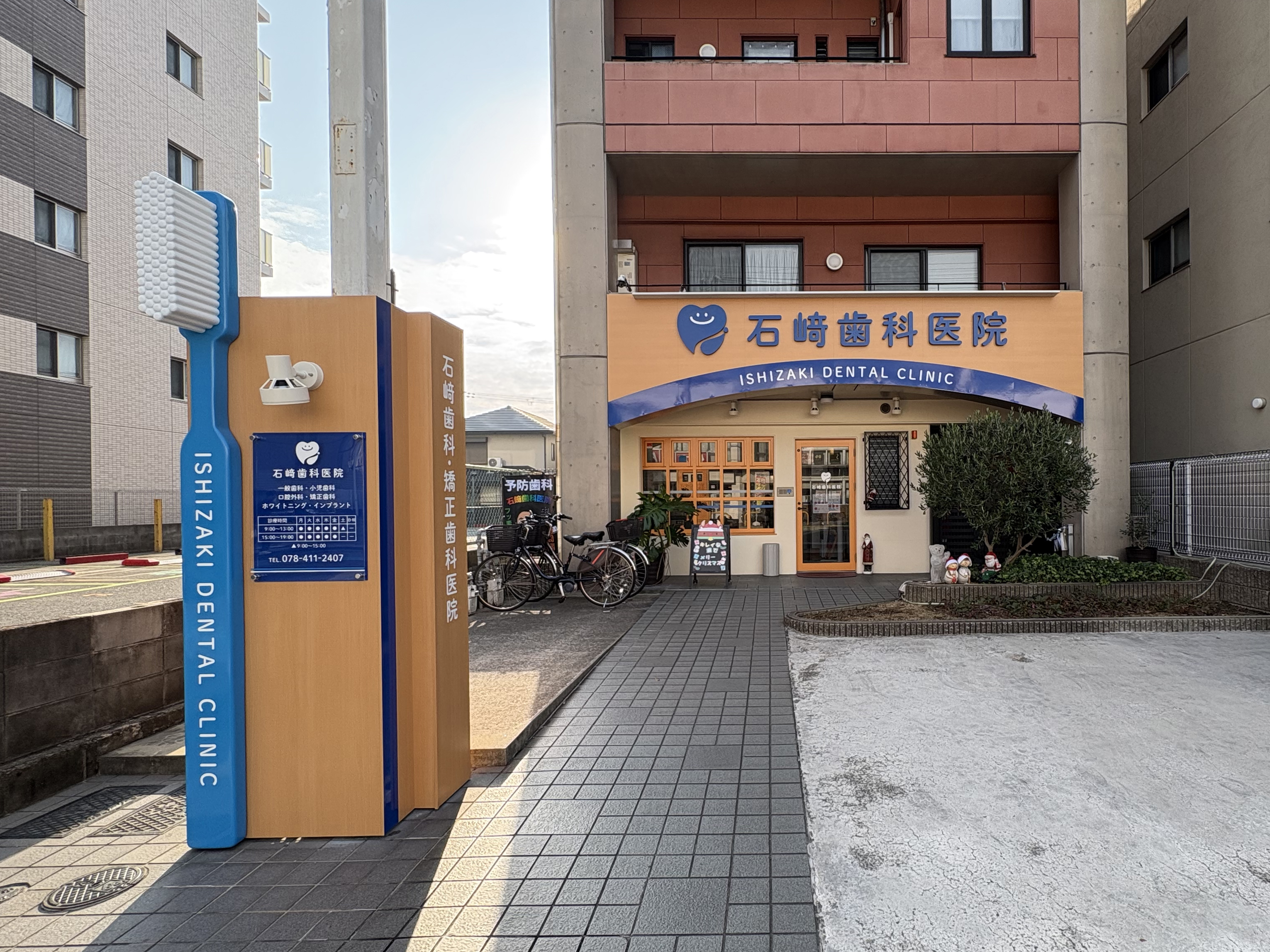 阪神本線青木駅より徒歩10分・兵庫県神戸市にある石﨑歯科医院さまの施工事例です。石﨑歯科医院さまのリニューアルに伴う外観制作を担当させていただきました。木目調のダイノックシートで落ち着いた印象にしつつ、大きな歯ブラシを設置することで、視認性と存在感を高めた外観にリニューアルしました。