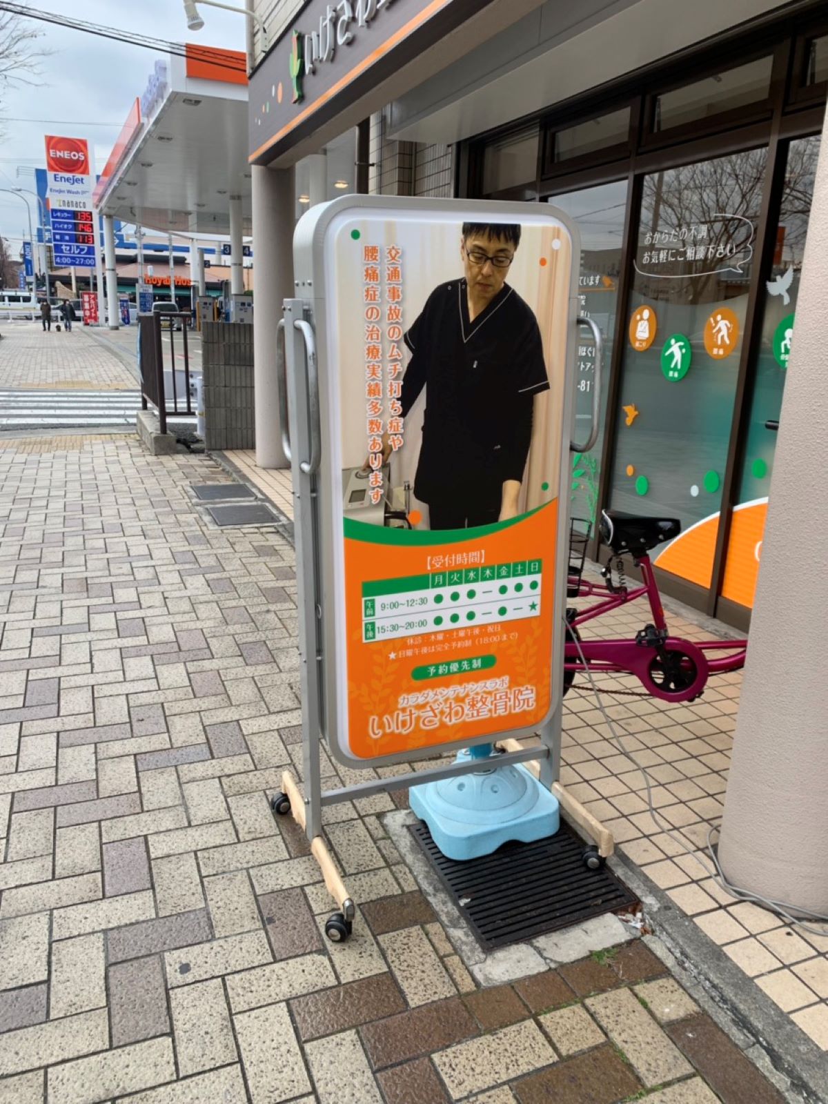 上部サインに落ち着いた木目調を使用し、オレンジをメインカラーとしたデザインで…