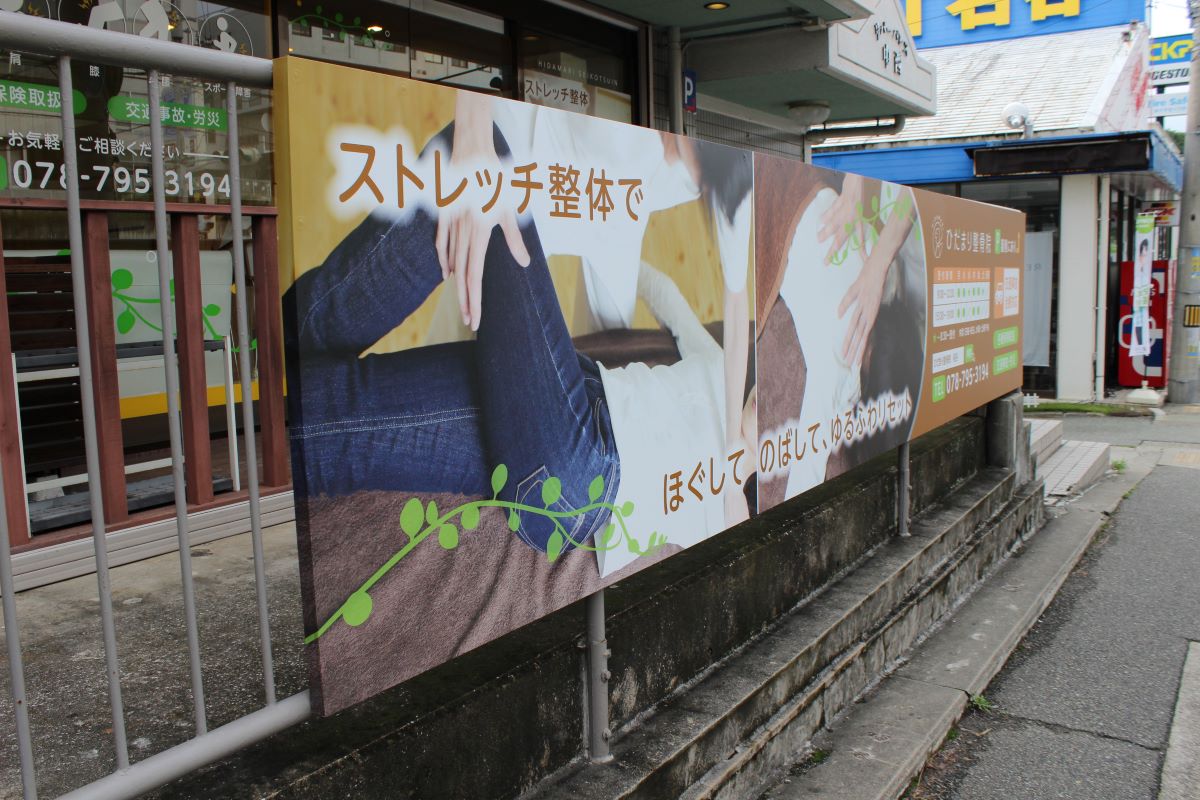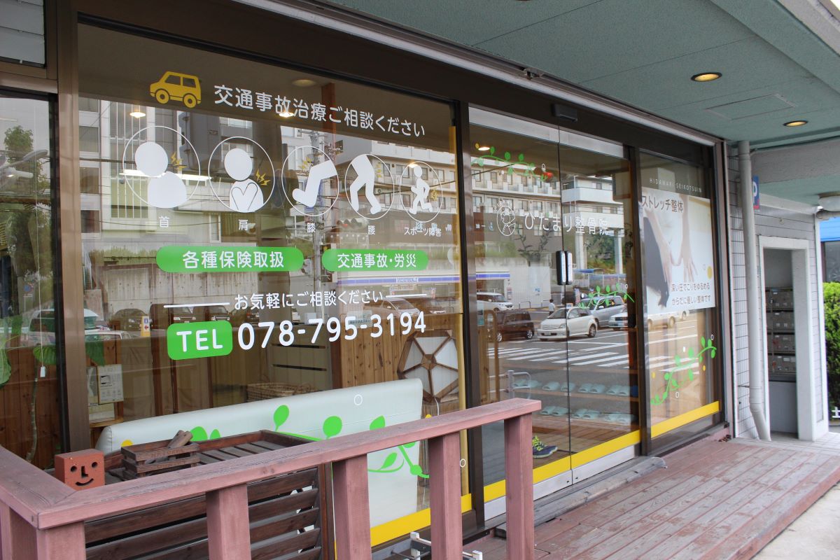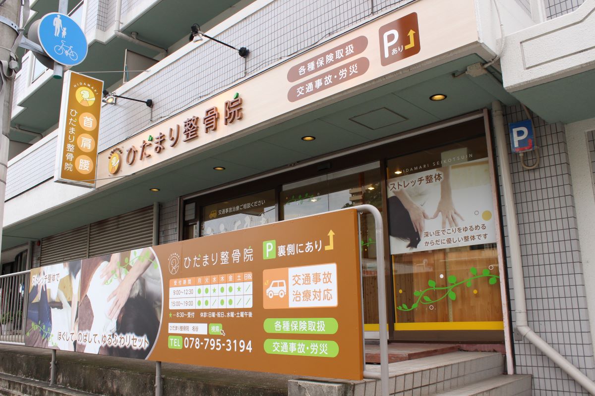 整骨院のキーカラーで建物全体をスペーシングして、明るく分かりやすい外観に仕上…