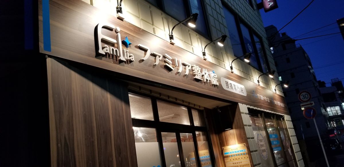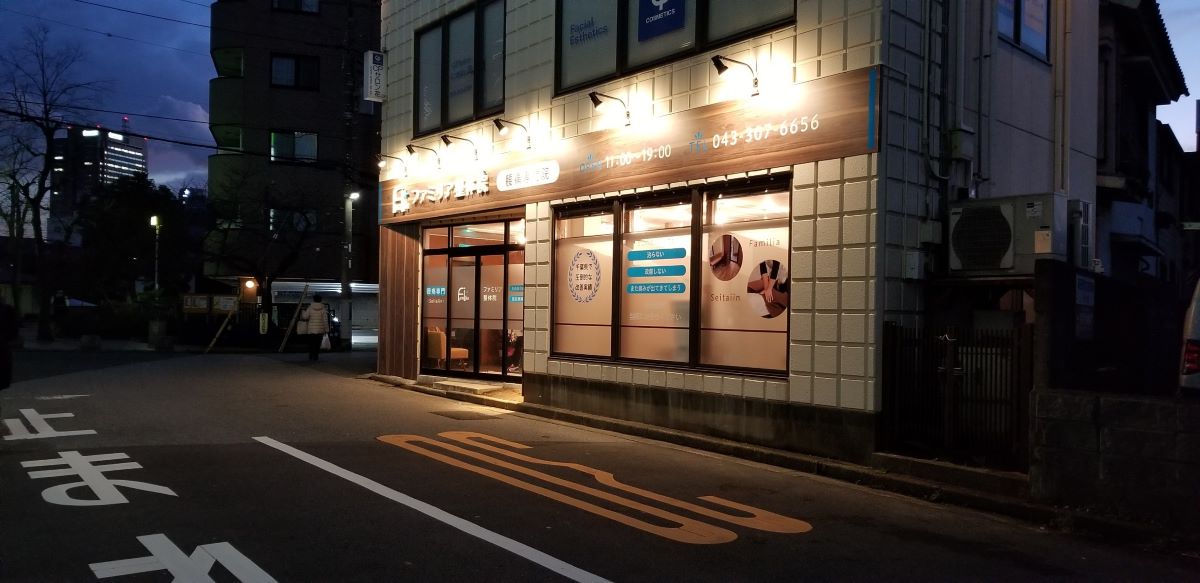 木目調のダイノックシートに立体文字を使用し、投光器で照らすことで落ち着きのある外観に仕上がりました。
