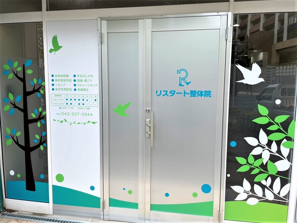 間口の広いガラス面にカッティングシートを利用して、親しみやすいデザインに仕上…