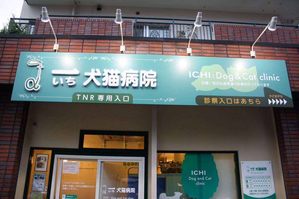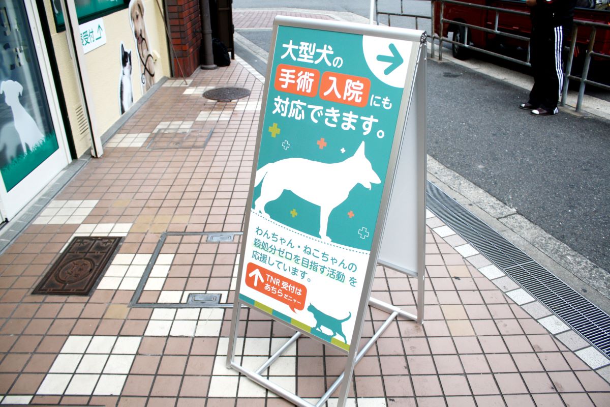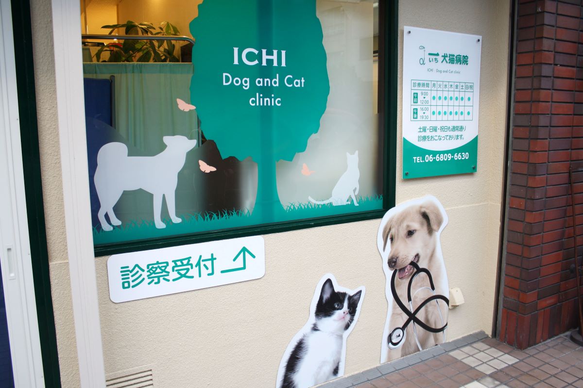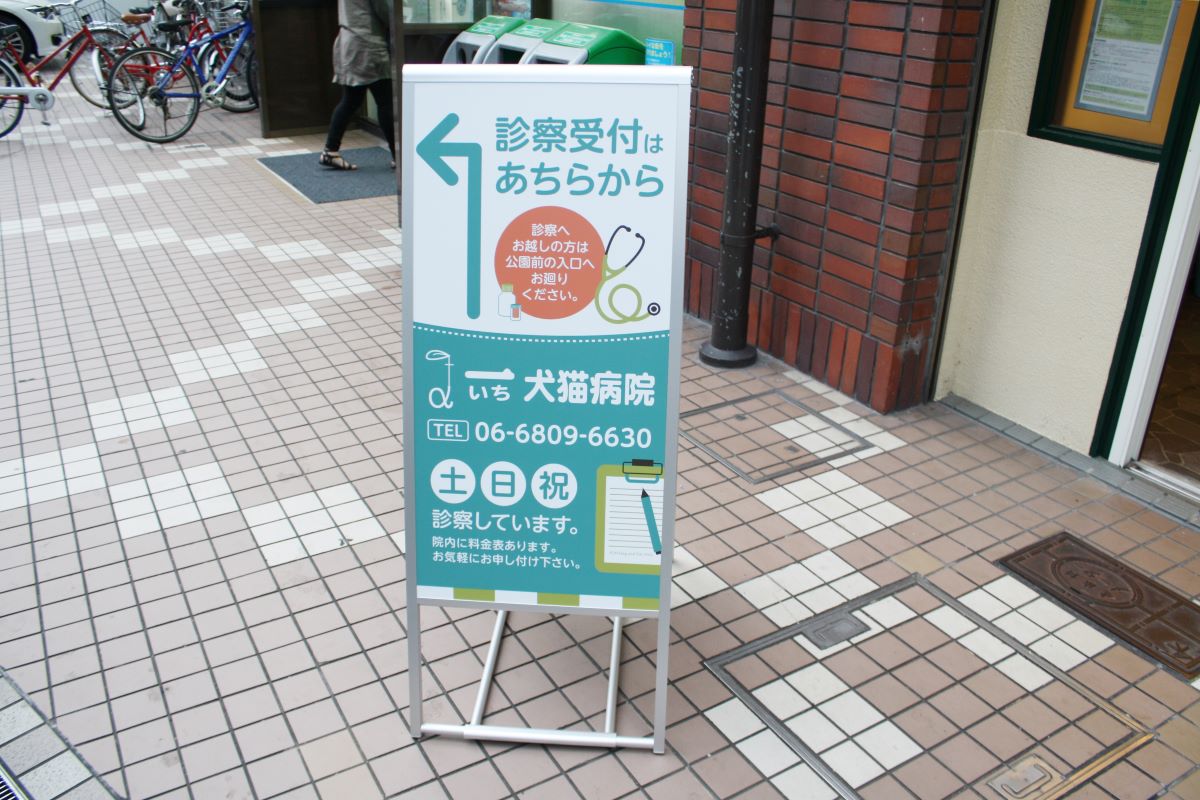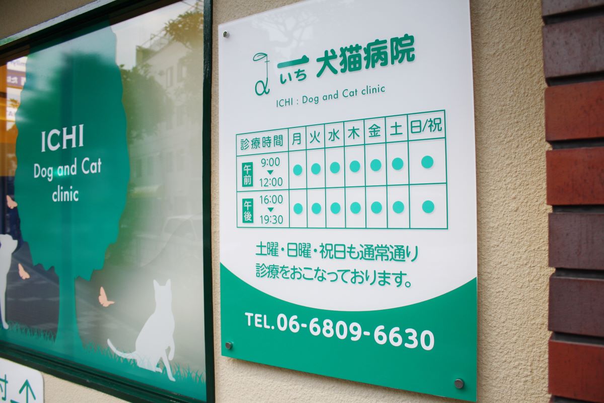 犬猫の写真を姿切りした壁面サインはわかりやすく、動物病院の目印になります。