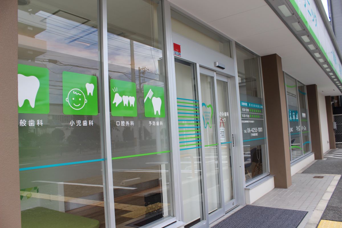広い間口を活かし、ガラスシートや突き出しサインで医院の情報が分かりやすいデザインに仕上げました。