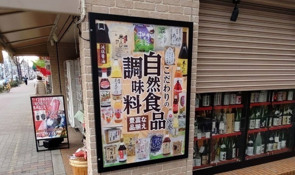 酒屋と分かるようなロゴマークも制作し、木目調のダイノックシートを使ってシンプルなデザインに仕上げました。