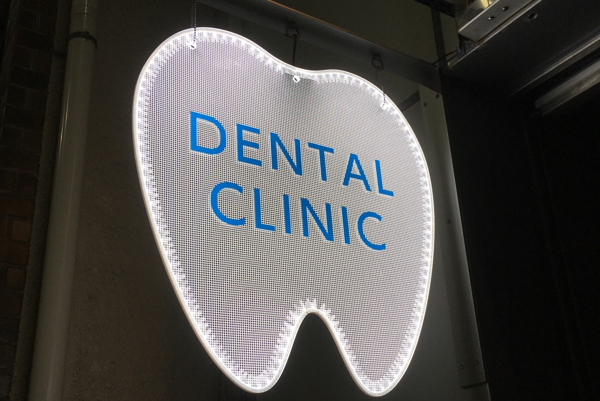 フロントチャンネル文字や歯型の電飾サインで、夜でも明るく目立つデザインに仕上げました。