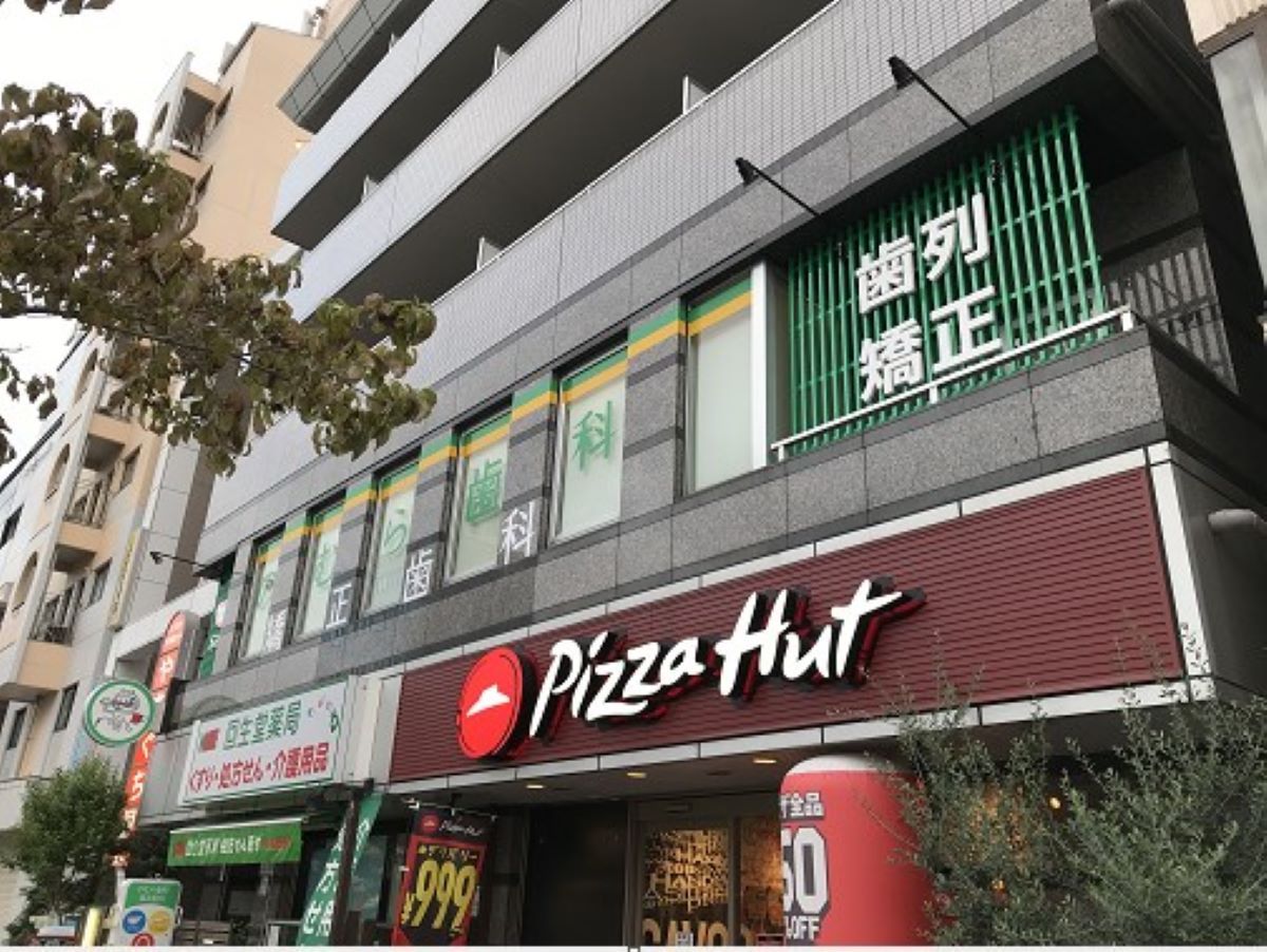 広い間口を活かし、歯型の時計やガラスシートでインパクトのある分かりやすい外観…
