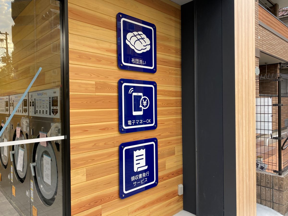格子を使用した看板に、光る立体文字と投光器を設置し優しい印象の分かりやすい外…