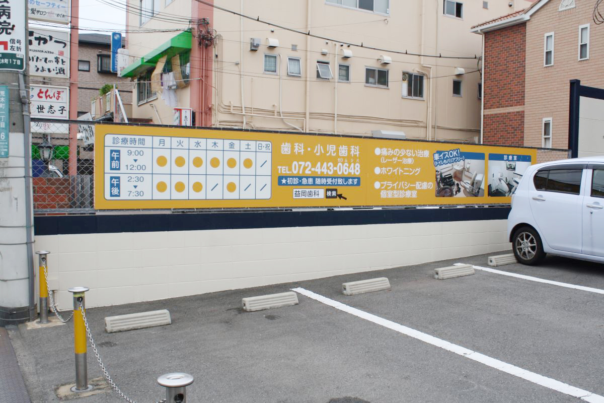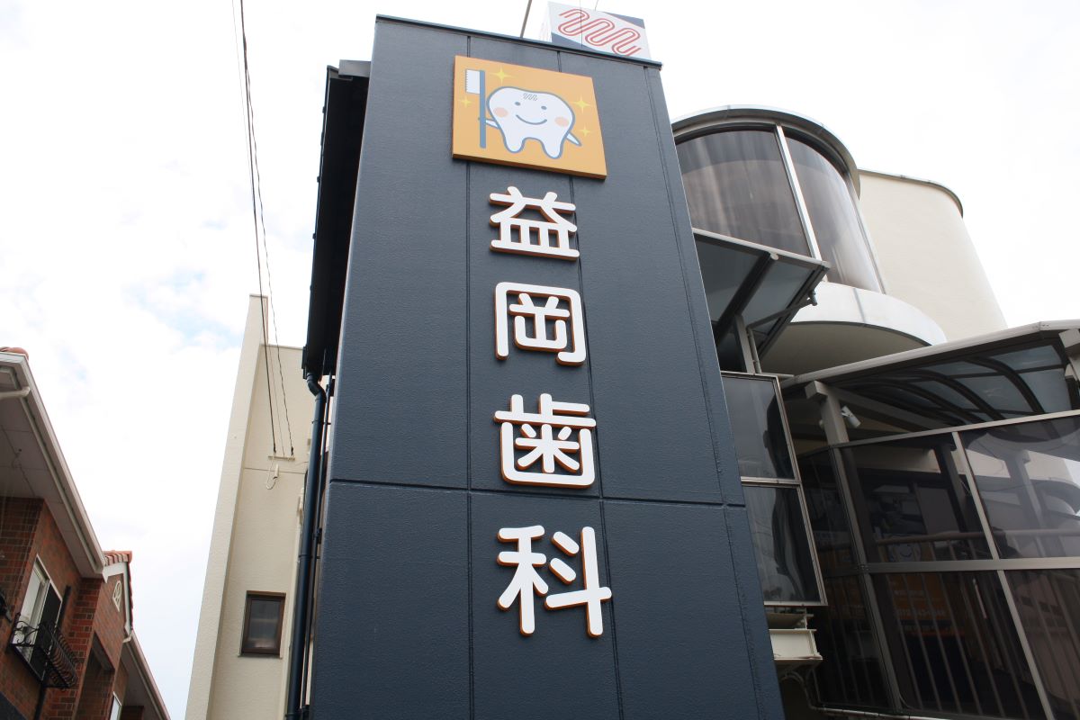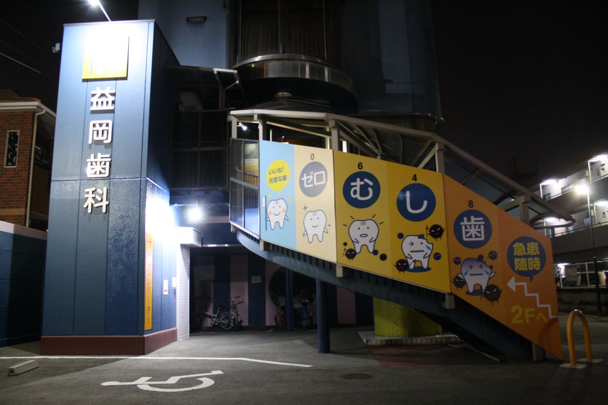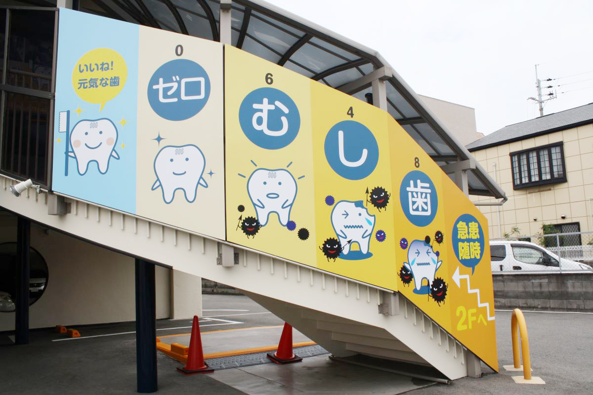 大きな壁面を活かして歯型の時計を設置し、思わず目を引く明るい外観にリニューア…