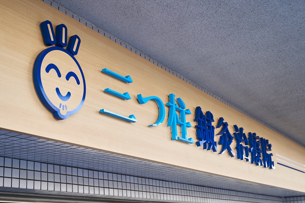 角の壁面を活かして、立体文字と診療案内板を設置することでシンプルに分かりやす…