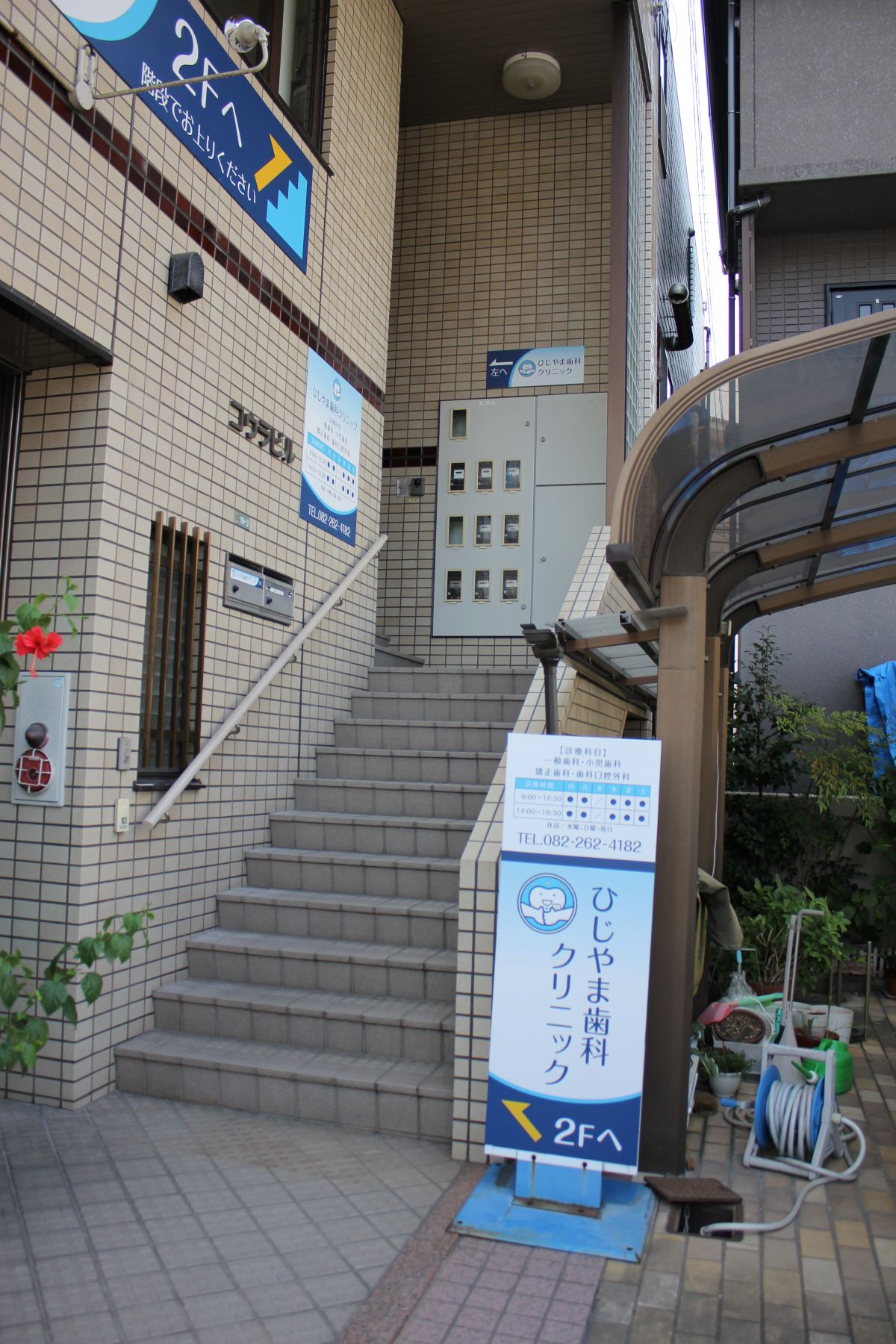 2F店舗への誘導のため、階段にシートを貼り分かりやすい外観に仕上げました。…