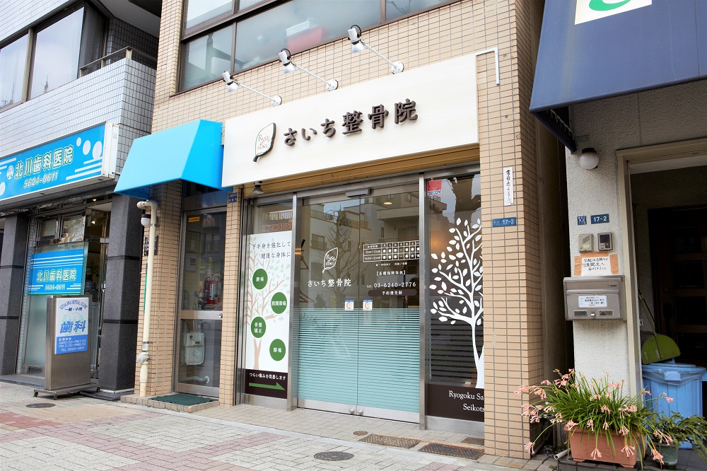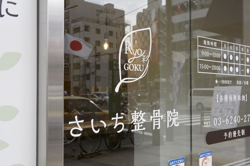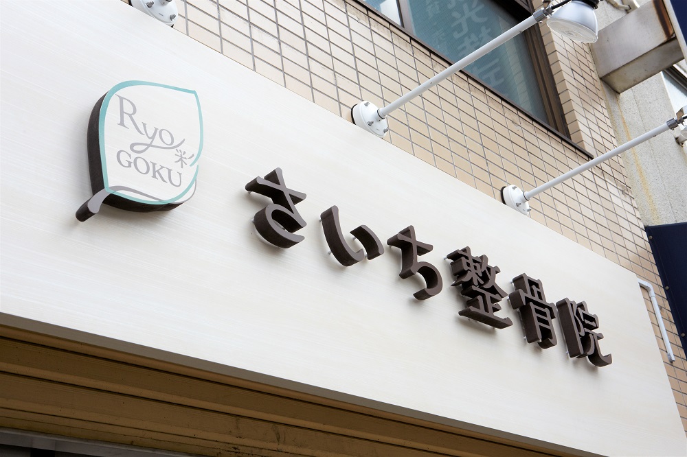 整骨院のキーカラーで建物全体をスペーシングして、明るく分かりやすい外観に仕上…