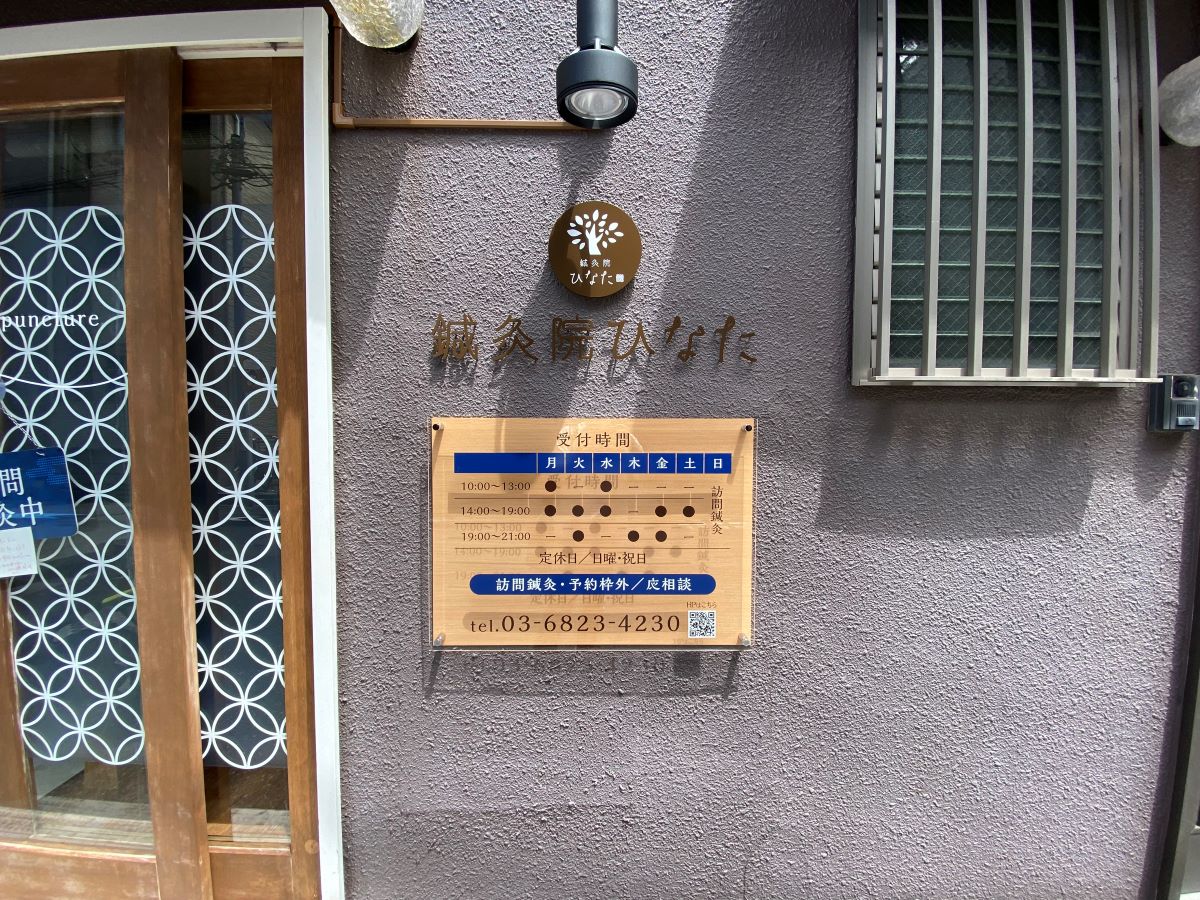 建物の雰囲気を壊さないように、和風の落ち着いた看板に仕上げました。A…
