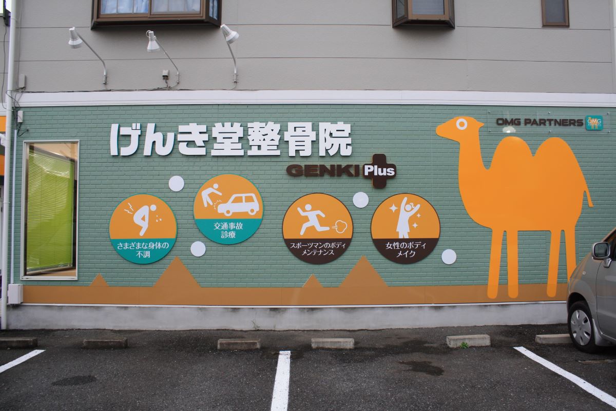 壁面のラクダの姿切りサインはインパクトがあり、印象に残ります。